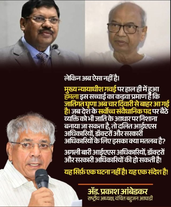 संवैधानिक संस्था सुप्रीम कोर्ट के मुख्य न्यायाधीश पर जुता फेंकने की कोशिश यह सिर्फ़ एक घटना नहीं है। यह एक संदेश है! ॲड. प्रकाश आंबेडकर (राष्ट्रीय अध्यक्ष, वंचित बहुजन आघाडी)