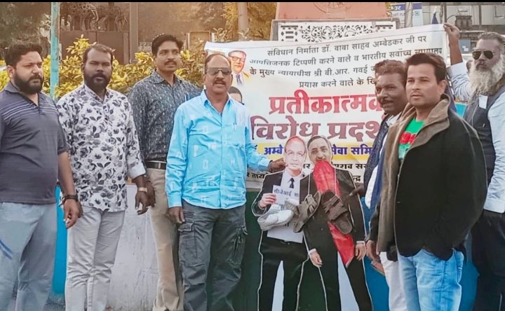 भारतीय संविधान निर्माता डॉ. बाबा साहब अम्बेडकर पर आपत्तिजनक टिपण्णी करने वाले और सुप्रीम कोर्ट के सीजेआई बीआर गवई पर जूता फेंकने का प्रयास करने वाले के खिलाफ मंगलवार को डॉ. अम्बेडकर अनुयायियों ने इंदौर मे एक अनूठा प्रतीकात्मक विरोध प्रदर्शन किया ।मध्यप्रदेश के ग्वालियर हाईकोर्ट खंडपीठ मे संविधान निर्माता डॉ. बाबा साहब अम्बेडकर की प्रतिमा लगाने को लेकर लम्बे समय से वकीलों के दो गुटों मे विवाद चल रहा है। इसी बीच प्रतिमा का विरोध करने वाले पक्ष का नेतृत्व करने वाले वकील अनिल मिश्रा ने डॉ. बाबा साहब अम्बेडकर पर आपत्तिजनक टिप्पणी की और अपनी जुबान से लगातार बाबा साहब का अपमान कर रहा है। उसकी इस हरकत से बाबा साहब के अनुयायियों मे भारी रोष है।उसके द्वारा की गई आपत्तिजनक टिप्पणी के विरोध मे इंदौर की डॉ. अम्बेडकर युग सेवा समिति ने अपने अनूठे प्रतीकात्मक विरोध प्रदर्शन के दौरान अनिल मिश्रा के पुतले की गन्दी जुबान को फिनाइल से धोकर मोड़ दिया। और सीजेआई बीआर गवई पर जूता फेंकने का प्रयास करने वाले राकेश किशोर के पुतले को जूतों की माला पहनाकर जूते मारे। और दोनों के पुतले सड़क पर फेंक दिए, जिसपर से वाहन गुजरते रहे।समिति का कहना है की बाबा साहब डॉ. अम्बेडकर पर आपत्तिजनक टिपण्णी को सहन नहीं करेंगे। अनिल मिश्रा और राकेश किशोर को उनके कृत्य के लिए विधि सम्मत सज़ा मिलनी चाहिए।समिति ने बताया की यह विरोध प्रदर्शन किसी जाति, धर्म, संप्रदाय, पार्टी के विरोध मे नहीं था। बल्कि उन तुच्छ मानसिकता वाले लोगो के खिलाफ था जो बाबा साहब का और संविधान का अपमान करते है और जातिवाद करते है।प्रदर्शन से पूर्व समिति ने डॉ. अम्बेडकर प्रतिमा स्थल पर हरियाणा मे जातिगत प्रताड़ना से परेशान होकर आत्महत्या करने वाले आईपीएस वाई पूरन कुमार को श्रद्धांजलि भी अर्पित की।इस अवसर पर समिति के व सामाजिक कार्यकर्ता मुरलीधर राहुल मेटांगे, भीमराव सरदार, रघुवीर मरमट, ईश्वर तायड़े, योगेंद्र गवांदे, भारत निम्बाड़कर, राकेश बंदावड़े, उमेश लोदवाल, सिद्धार्थ वाकोड़े, संतोष इंगले के साथ भारतीय संविधान सम्मान समिति लखनऊ की राष्ट्रीय महामंत्री बौद्धमती विमलादेवी, भारतीय संविधान सम्मान समिति के राष्ट्रीय अध्यक्ष भंते विभुतवंश पटना, बिहार से तथा बौद्धगया के भंते सिद्धार्थ बोधि, नांदेड़ की भिक्षुणी सासन जीना, भिक्षुणी संघशीला और नागपुर से रामाबाई वाघमारे, कांताबाई गायकवाड़ उपस्थित थे।इस अवसर पर समिति के व सामाजिक कार्यकर्ता मुरलीधर राहुल मेटांगे, भीमराव सरदार, रघुवीर मरमट, ईश्वर तायड़े, योगेंद्र गवांदे, भारत निम्बाड़कर, राकेश बंदावड़े, उमेश लोदवाल, सिद्धार्थ वाकोड़े, संतोष इंगले के साथ भारतीय संविधान सम्मान समिति लखनऊ 
