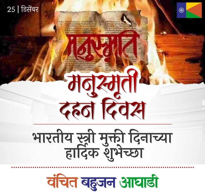 मनुस्मृति दहन दिवस!!! 25 दिसंबर 1927 को, डॉ. बाबासाहेब अंबेडकर ने मनुस्मृति का दहन करके अन्याय, असमानता और दासता पर आधारित सामाजिक व्यवस्था को प्रत्यक्ष चुनौती दी। मनुस्मृति कोई धार्मिक ग्रंथ नहीं थी, बल्कि यह भेदभाव का प्रतीक थी, जो महिलाओं को दासता में धकेलती थी और शोषण को जन्म देती थी। बाबासाहेब ने इसे जलाकर समानता, स्वतंत्रता और बंधुत्व का मार्ग दिखाया। मनुस्मृति दहन केवल एक पुस्तक के विरुद्ध विरोध नहीं था। यह न्याय और मानवीय गरिमा पर आधारित समाज के निर्माण की शुरुआत थी। वंचित बहुजन अघाड़ी आज भी बाबासाहेब के क्रांतिकारी विचारों की नींव पर खड़ी है। हमारा संकल्प अन्यायपूर्ण विचारों का विरोध करना और लोकतंत्र को मजबूत करना है। मनुस्मृति का दहन करके बाबासाहेब ने महिलाओं को दासता से मुक्त किया।