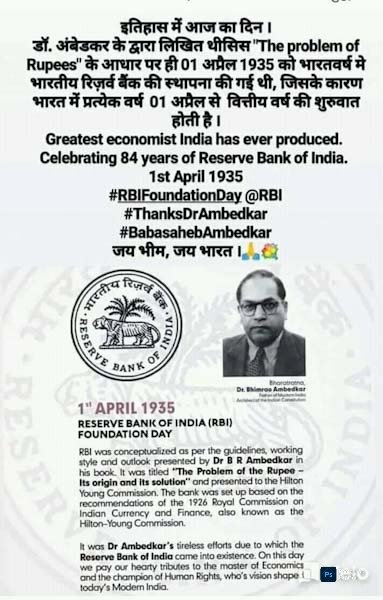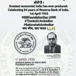1 अप्रैल 1935 भारतीय अर्थव्यवस्था के लिए एक ऐतिहासिक दिन है। भारतीय रिजर्व बैंक की स्थापना इसी दिन हुई थी। की स्थापना डॉ। बाबासाहेब अम्बेडकर की पुस्तक ‘द प्रॉब्लम ऑफ द रुपी’ का बहुत प्रभाव था। उन्होंने भारतीय मौद्रिक प्रणाली में खामियों की ओर इशारा किया और देश के लिए एक मजबूत केंद्रीय बैंक की आवश्यकता के बारे में बताया।